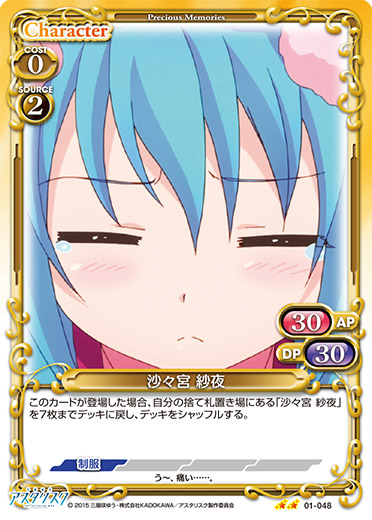 | このカードが登場した場合、自分の捨て札置き場にある「沙々宮 紗夜」を7枚までデッキに戻し、デッキをシャッフルする。 | ||