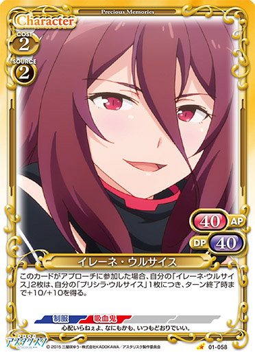 | このカードは、自分のメインフェイズ以外でも登場させることができる。このカードが登場した場合、自分の「イレーネ・ウルサイス」または「プリシラ・ウルサイス」1枚は、ターン終了時まで+20/±0または±0/+20を得る。 | ||