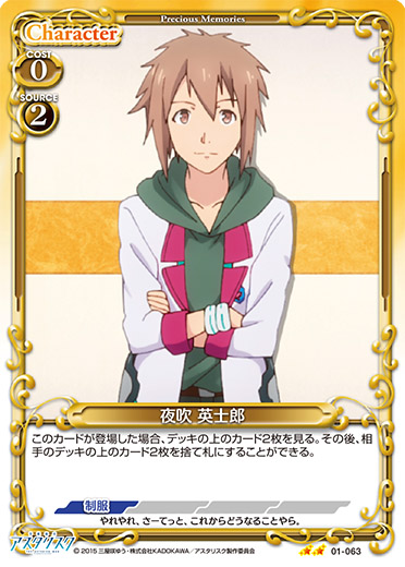 | レベルアップこのカードにレベルアップしたターンの間に、このカードがアプローチに参加した場合、1枚以上の任意の枚数の手札を捨て札にすることができる。捨て札にした場合、捨て札にした枚数以下の使用コストの値を持つ相手のキャラ1枚をゲームから取り除くことができる。 | ||
