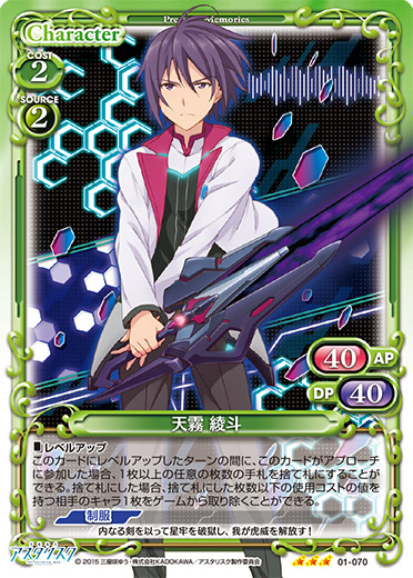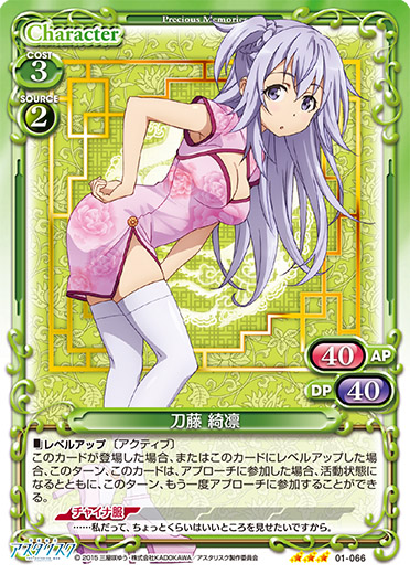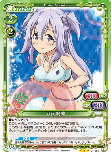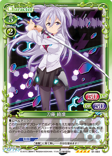 | 自分の「刀藤 綺凛」がレベルアップした場合、カードを1枚引く。自分の「刀藤 綺凛」がレベルアップした場合、自分の「刀藤 綺凛」1枚は、このターン、発生コストの値が2のキャラには妨害されない。 | ||