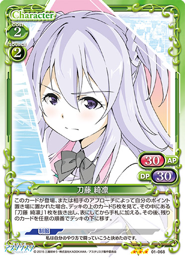 | このカードが登場、または相手のアプローチによって自分のポイント置き場に置かれた場合、デッキの上のカード5枚を見て、その中にある「刀藤 綺凛」1枚を抜き出し、表にしてから手札に加える。その後、残りのカードを任意の順番でデッキの下に移す。 | ||