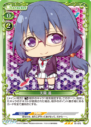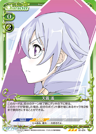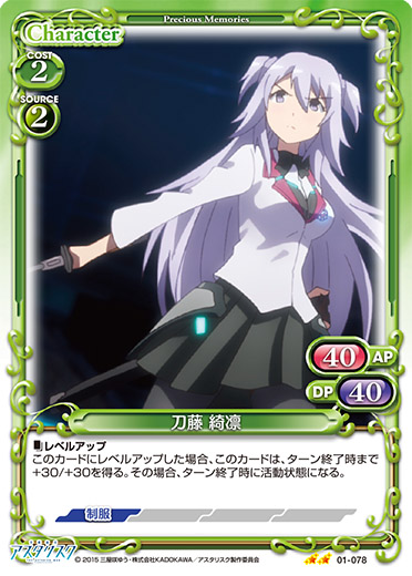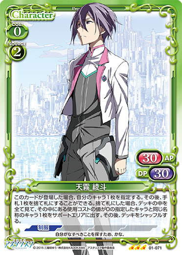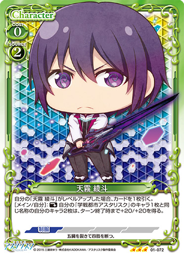 | 自分の「天霧 綾斗」がレベルアップした場合、カードを1枚引く。[メイン/自分]:《休》自分の『学戦都市アスタリスク』のキャラ1枚と同じ名称の自分のキャラ2枚は、ターン終了時まで+20/+20を得る。 | ||