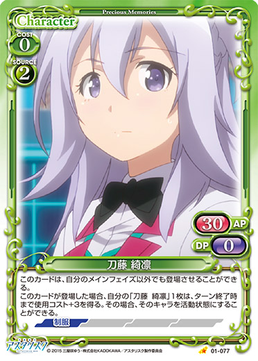 | このカードは、自分のメインフェイズ以外でも登場させることができる。このカードが登場した場合、自分の「刀藤 綺凛」1枚は、ターン終了時まで使用コスト+3を得る。その場合、そのキャラを活動状態にすることができる。 | ||