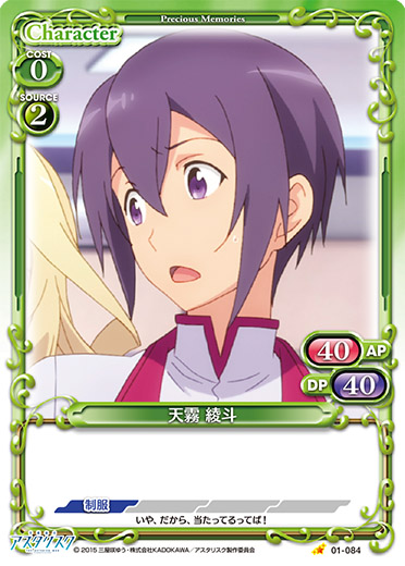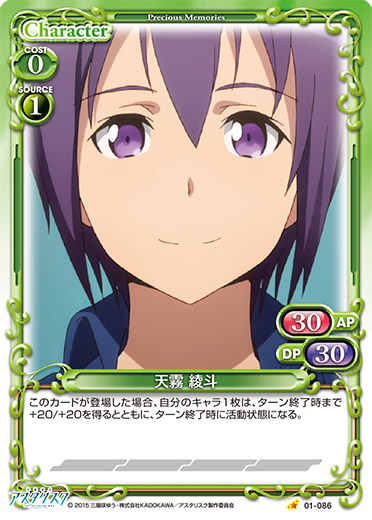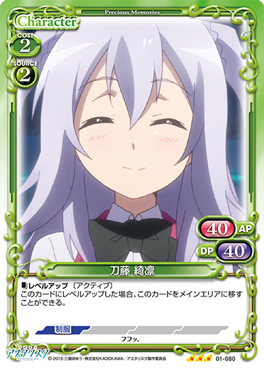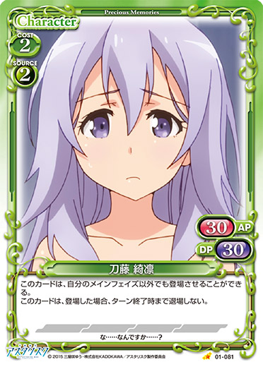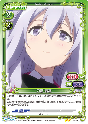 | このカードは、自分のメインフェイズ以外でも登場させることができる。このカードが登場した場合、自分の「刀藤 綺凛」1枚は、ターン終了時まで+20/+20を得る。 | ||