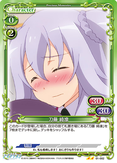 | このカードが登場した場合、自分の捨て札置き場にある「刀藤 綺凛」を7枚までデッキに戻し、デッキをシャッフルする。 | ||