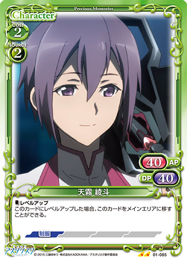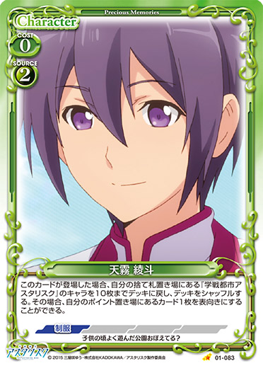 | このカードが登場した場合、自分の捨て札置き場にある『学戦都市アスタリスク』のキャラを10枚までデッキに戻し、デッキをシャッフルする。その場合、自分のポイント置き場にあるカード1枚を表向きにすることができる。 | ||