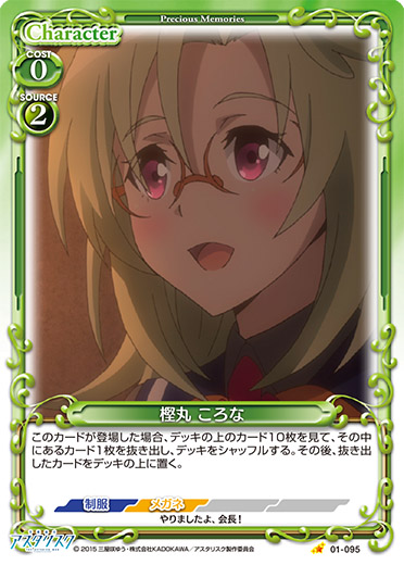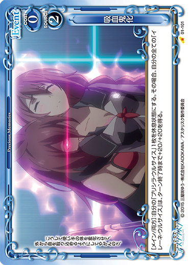 | [アプローチ/両方]:相手のキャラ1枚は、ターン終了時まで-20/-20を得る。その場合、自分の「ユリス=アレクシア・フォン・リースフェルト」1枚は、このターン、APまたはDPの値が0のキャラには妨害されない。 | ||