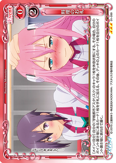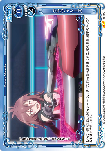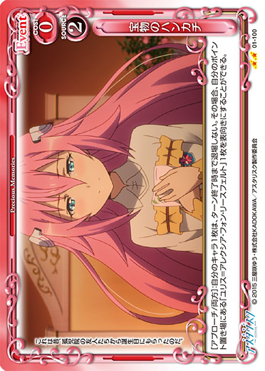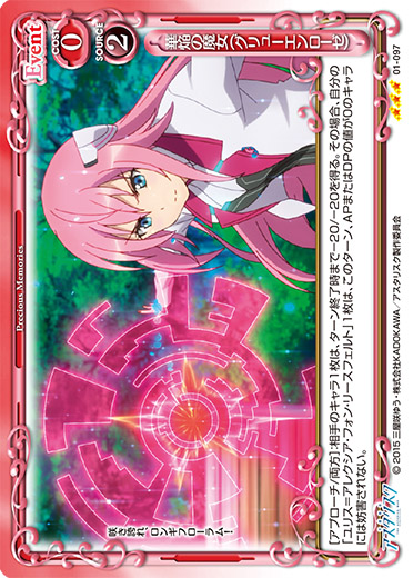 | [アプローチ/両方]:自分のキャラ1枚は、ターン終了時まで退場しない。その場合、自分のポイント置き場にある「ユリス=アレクシア・フォン・リースフェルト」1枚を表向きにすることができる。 | ||