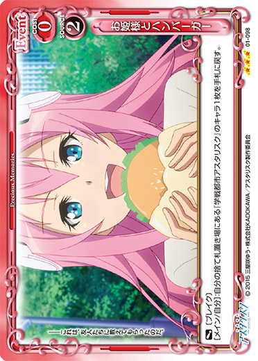 | 〔ブレイク〕[メイン/自分]:自分の捨て札置き場にある『学戦都市アスタリスク』のキャラ1枚を手札に戻す。 | ||