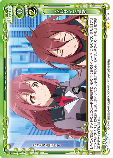 | [メイン/自分]:デッキの上のカード5枚を見て、その中にある「イレーネ・ウルサイス」または「プリシラ・ウルサイス」1枚を抜き出し、表にしてから手札に加える。その後、残りのカードを任意の順番でデッキの下に移す。 | ||