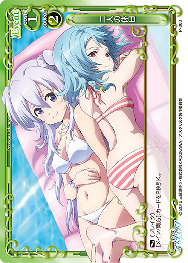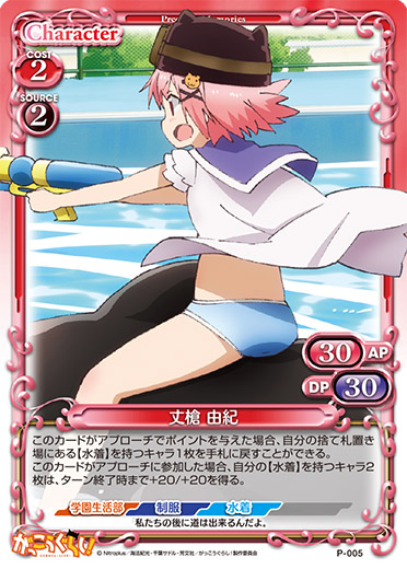 | このカードがアプローチでポイントを与えた場合、自分の捨て札置き場にある【水着】を持つキャラ1枚を手札に戻すことができる。このカードがアプローチに参加した場合、自分の【水着】を持つキャラ2枚は、ターン終了時まで+20/+20を得る。 | ||