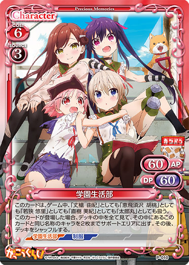 | 〔コンビ〕[アプローチ/自分]:《休》自分の捨て札置き場にある『がっこうぐらし!』のキャラ4枚を任意の順番でデッキの下に移す。その場合、自分の『がっこうぐらし!』のキャラ1枚を活動状態にすることができる。 | ||
