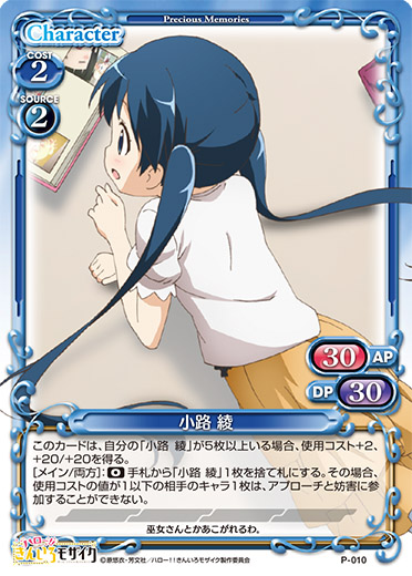 | このカードは、自分の「小路 綾」が5枚以上いる場合、使用コスト+2、+20/+20を得る。[メイン/両方]:《0》手札から「小路 綾」1枚を捨て札にする。その場合、使用コストの値が1以下の相手のキャラ1枚は、アプローチと妨害に参加することができない。 | ||