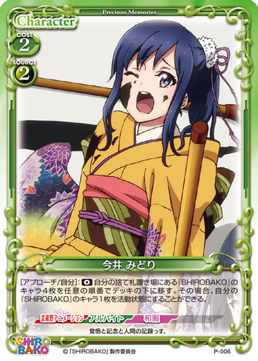 | [アプローチ/自分]:《0》自分の捨て札置き場にある『SHIROBAKO』のキャラ4枚を任意の順番でデッキの下に移す。その場合、自分の『SHIROBAKO』のキャラ1枚を活動状態にすることができる。 | ||