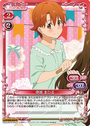 | このカードが登場、または相手のアプローチによって自分のポイント置き場に置かれた場合、デッキの上のカード5枚を見て、その中にある「伊波 まひる」1枚を抜き出し、表にしてから手札に加える。その後、残りのカードを任意の順番でデッキの下に移す。 | ||