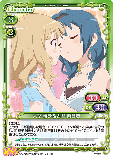 | 〔コンビ〕このカードが登場した場合、+10/+10コインが乗っていない自分の「大室 櫻子」または「古谷 向日葵」1枚の上に+10/+10コインを1個乗せることができる。 | ||