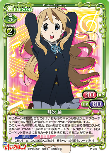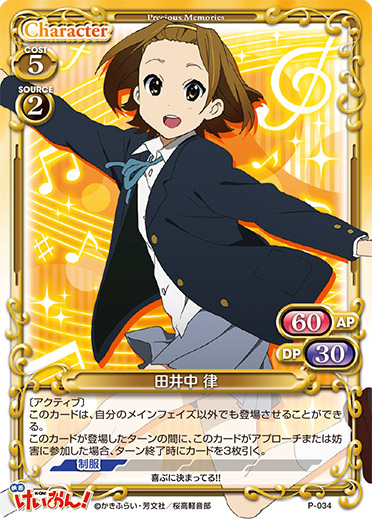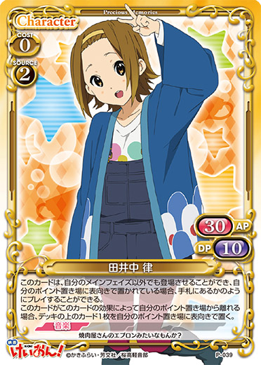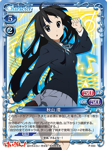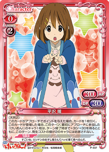 | 〔天然2〕このカードがアプローチでポイントを与えた場合、カードを1枚引く。このカードが登場した場合、このターン、最初にアプローチに参加した『けいおん!』のキャラ1枚は、ターン終了時まで+30/+30を得るとともに、このターン、発生コストの値が2のキャラには妨害されない。 | ||