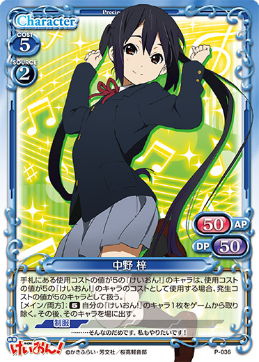 | 手札にある使用コストの値が5の『けいおん!』のキャラは、使用コストの値が5の『けいおん!』のキャラのコストとして使用する場合、発生コストの値が5のキャラとして扱う。[メイン/両方]:《5》自分の『けいおん!』のキャラ1枚をゲームから取り除く。その後、そのキャラを場に出す。 | ||