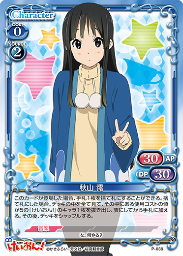 | このカードが登場した場合、手札1枚を捨て札にすることができる。捨て札にした場合、デッキの中を全て見て、その中にある使用コストの値が5の『けいおん!』のキャラ1枚を抜き出し、表にしてから手札に加える。その後、デッキをシャッフルする。 | ||