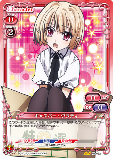 | このカードは、自分の『ハイスクールD×D BorN』のキャラが登場するごとに、ターン終了時まで使用コスト+2、+30/+30を得る。このカードは、自分の『ハイスクールD×D BorN』のキャラがレベルアップするごとに、ターン終了時まで使用コスト+2、+30/+30を得る。 | ||