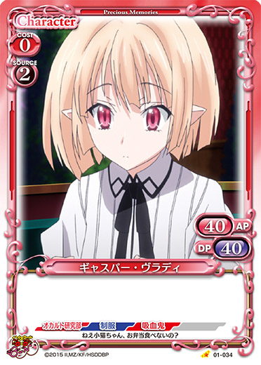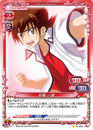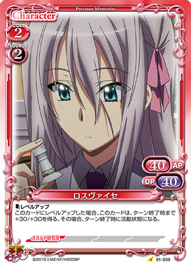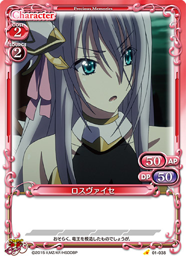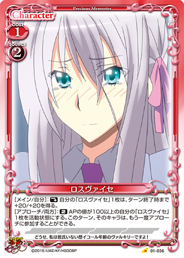 | [メイン/自分]:《休》自分の「ロスヴァイセ」1枚は、ターン終了時まで+20/+20を得る。[アプローチ/両方]:《2》APの値が100以上の自分の「ロスヴァイセ」1枚を活動状態にする。このターン、そのキャラは、もう一度アプローチに参加することができる。 | ||