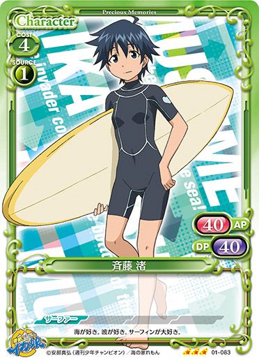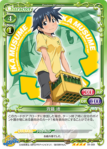 | 〔コンビ〕自分の「イカ娘」または【海の家れもん】を持つ自分のキャラがアプローチでポイントを与えた場合、自分のポイント置き場にある裏向きのカード1枚を表向きにすることができる。 | ||