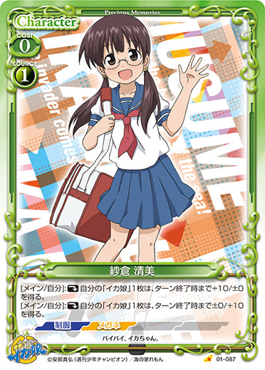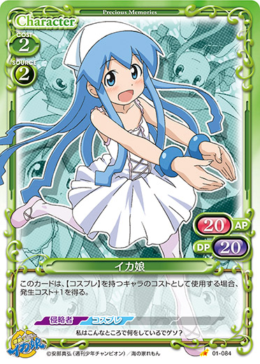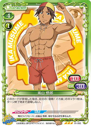 | このカードが登場した場合、自分の『侵略!イカ娘』のキャラ1枚は、ターン終了時まで退場しない。 | ||