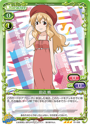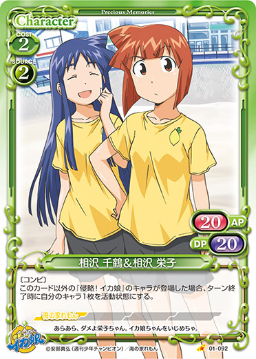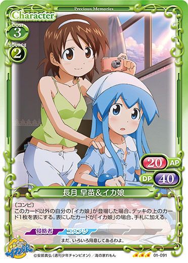 | 〔コンビ〕このカード以外の『侵略!イカ娘』のキャラが登場した場合、ターン終了時に自分のキャラ1枚を活動状態にする。 | ||