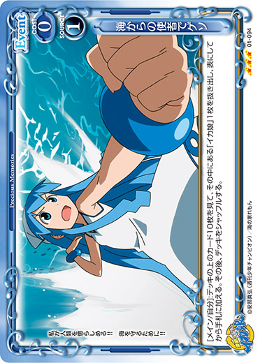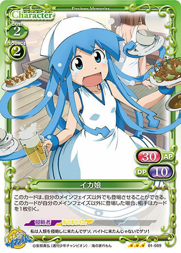 | 〔コンビ〕このカード以外の自分の「イカ娘」が登場した場合、デッキの上のカード1枚を表にする。表にしたカードが「イカ娘」の場合、手札に加える。 | ||