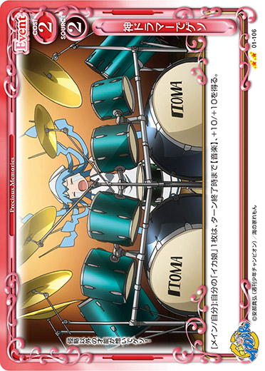 | [メイン/自分]:自分の「イカ娘」1枚は、ターン終了時まで【音楽】、+10/+10を得る。 | ||