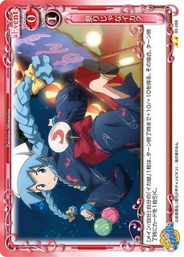 | [メイン/自分]:自分の「イカ娘」1枚は、ターン終了時まで+10/+10を得る。その場合、ターン終了時にカードを1枚引く。 | ||