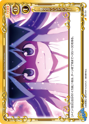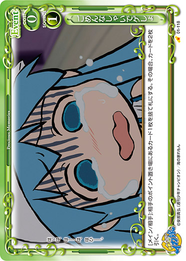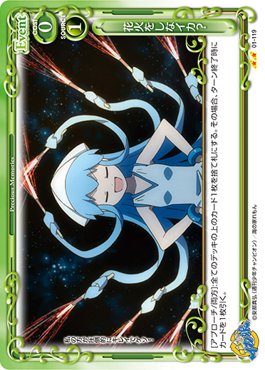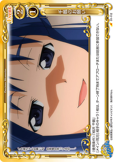 | 《使用条件》:「相沢 千鶴」[メイン/両方]:相手のキャラ1枚は、ターン終了時までアプローチまたは妨害に参加できない。 | ||
