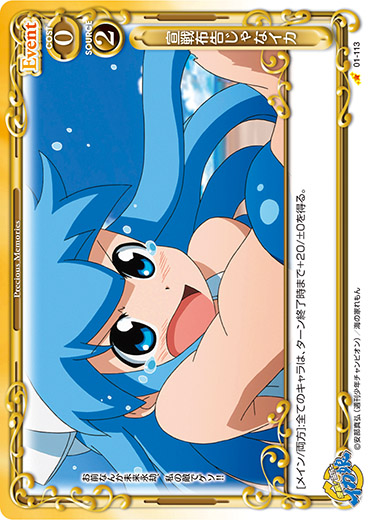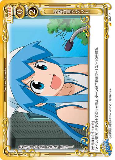 | 《使用条件》:「イカ娘」[メイン/両方]:自分の全てのキャラは、ターン終了時まで+10/+10を得る。 | ||