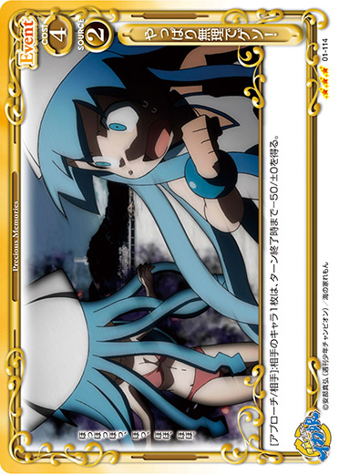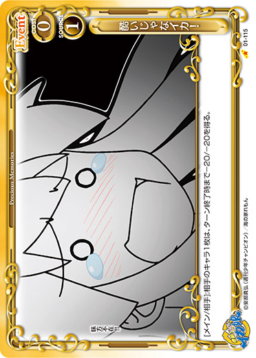 | [アプローチ/相手]:相手のキャラ1枚は、ターン終了時まで-50/±0を得る。 | ||