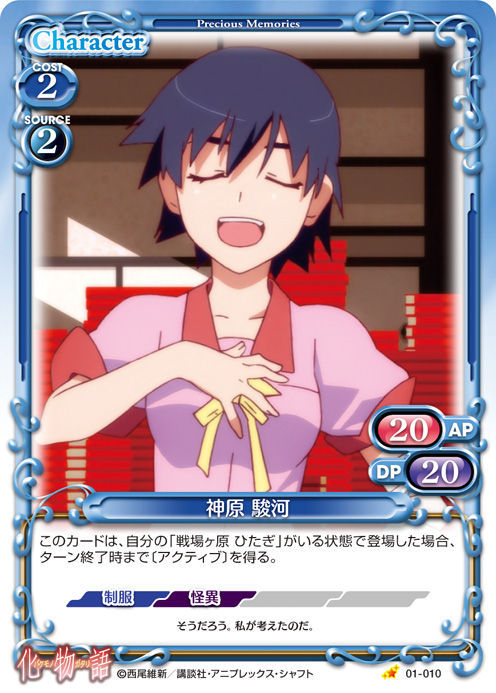 | このカードは、自分の「戦場ヶ原ひたぎ」がいる状態で登場した場合、ターン終了時まで〔アクティブ〕を得る。 | ||