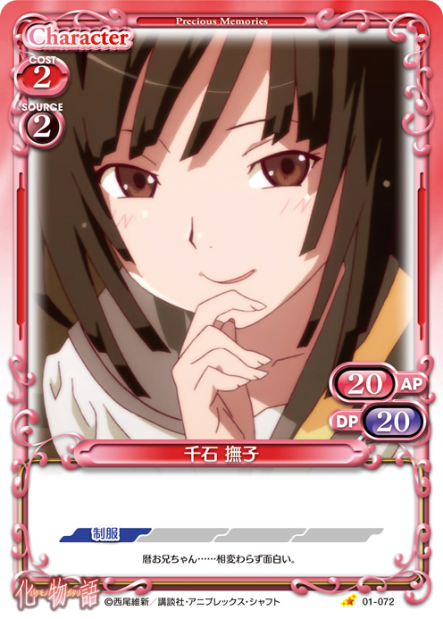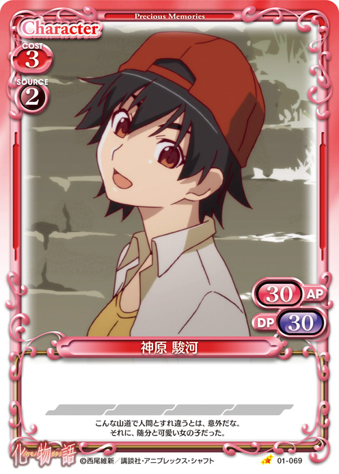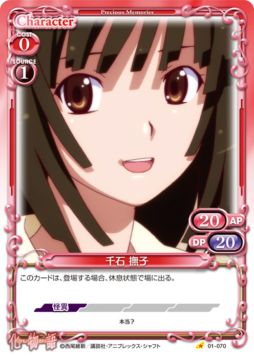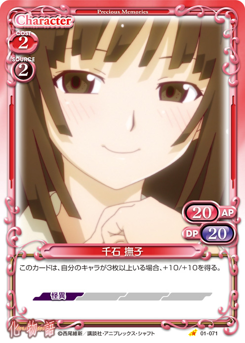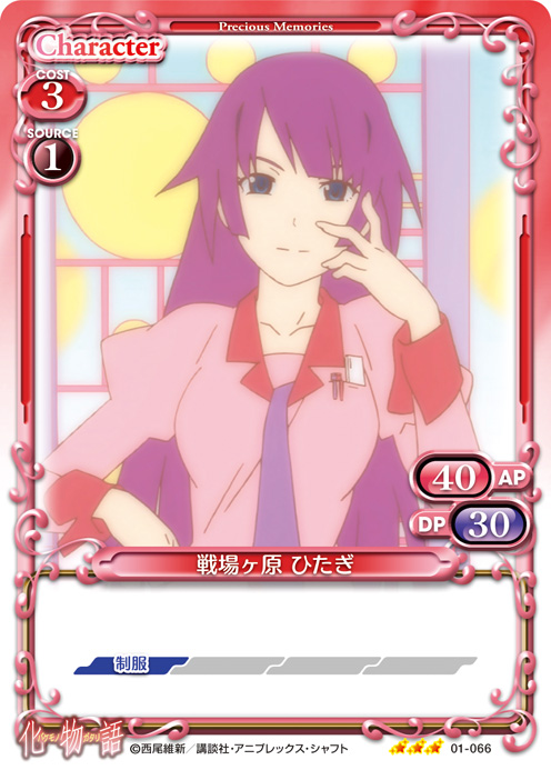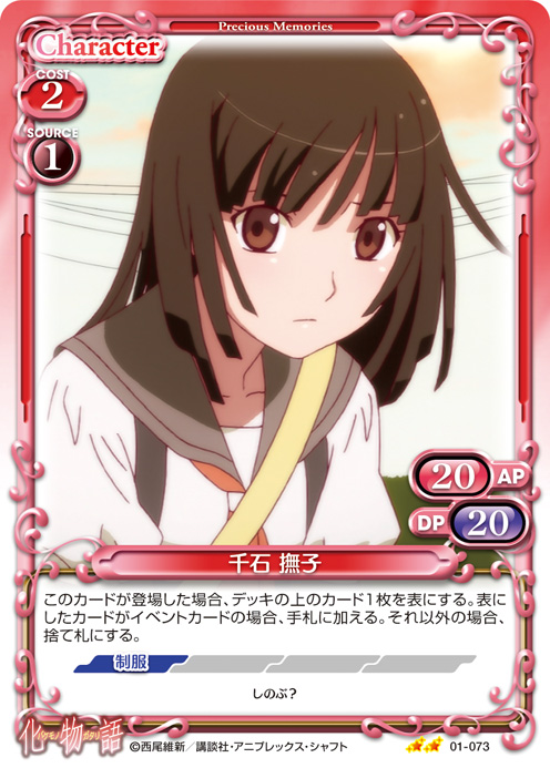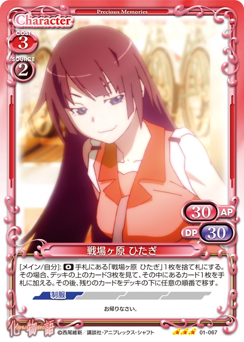 | [メイン/自分]:《0》手札にある「戦場ヶ原ひたぎ」1枚を捨て札にする。その場合、デッキの上のカード3枚を見て、その中にあるカード1枚を手札に加える。その後、残りのカードをデッキの下に任意の順番で移す。 | ||