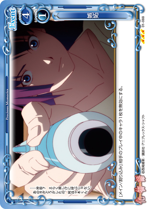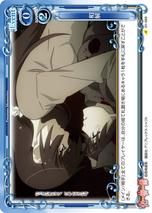 | 《使用条件》:「戦場ヶ原 ひたぎ」[アプローチ/相手]:相手のキャラ1枚は、ターン終了時まで-20/-20を得る。 | ||