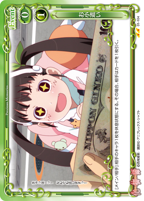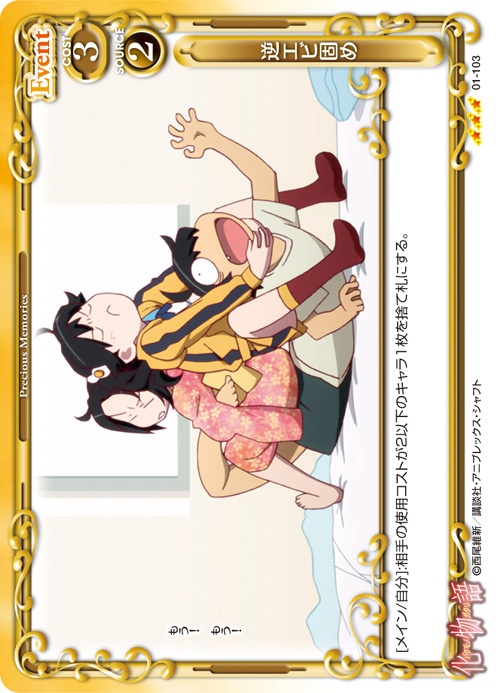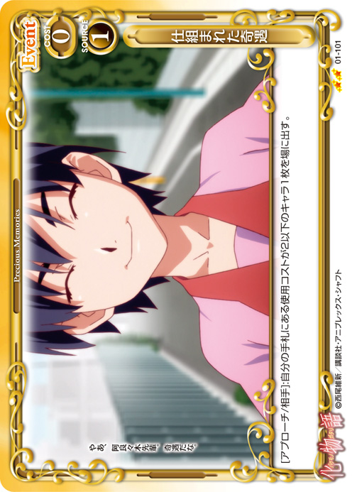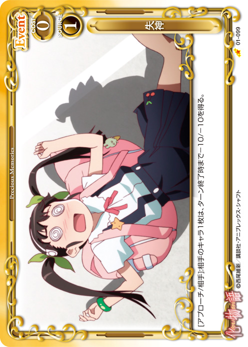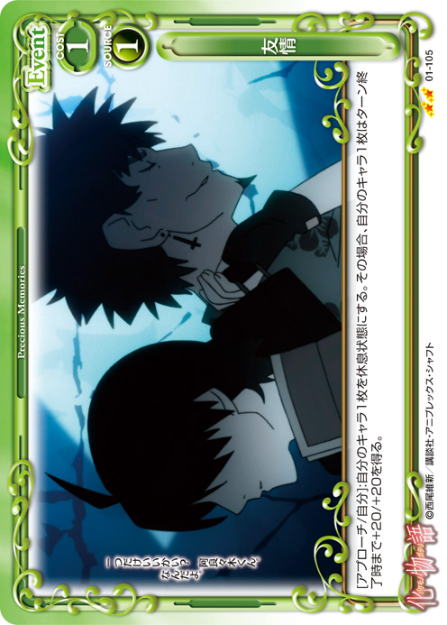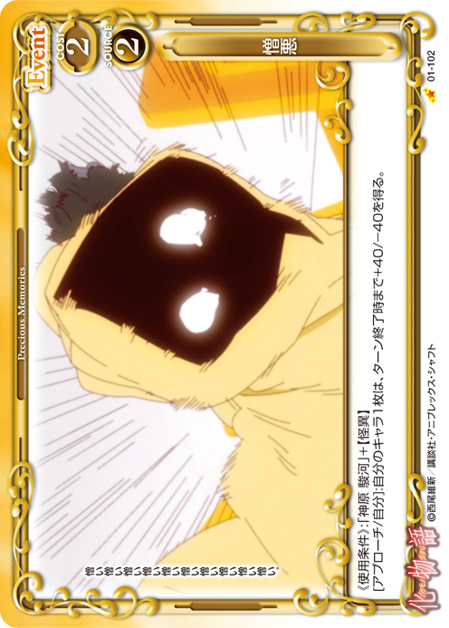 | 《使用条件》:「神原 駿河」+【怪異】[アプローチ/自分]:自分のキャラ1枚は、ターン終了時まで+40/-40を得る。 | ||