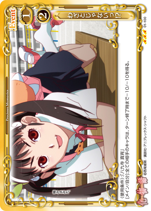 | 《使用条件》:「八九寺 真宵」[メイン/自分]:全ての相手のキャラは、ターン終了時まで-10/-10を得る。 | ||