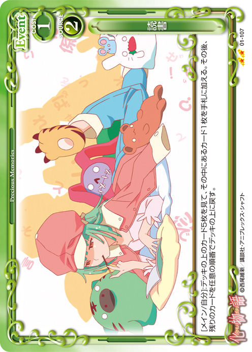 | [メイン/自分]:自分のキャラ1枚は、ターン終了時に活動状態になる。ターン終了時に自分のポイント置き場にある裏向きのカード1枚を表向きにすることができる。 | ||
