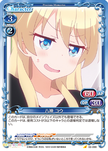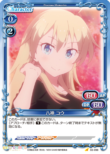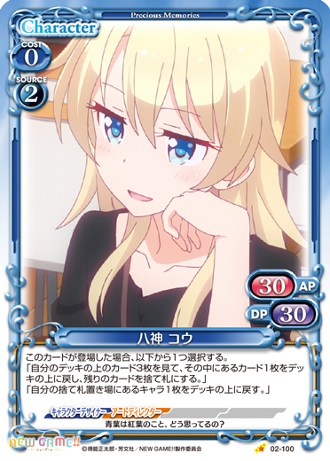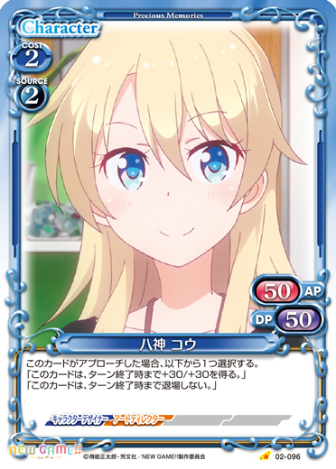 | このカードは、自分のメインフェイズ以外でも登場できる。このカードは、使用コストが3以下のキャラとの退場判定では退場しない。 | ||