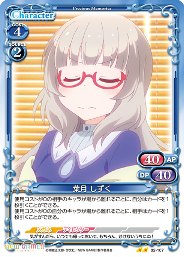 | 元の使用コストが4の自分のキャラが登場した場合、キャラ1枚は、ターン終了時まで+40/+40を得る。 | ||