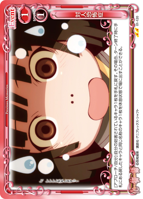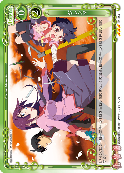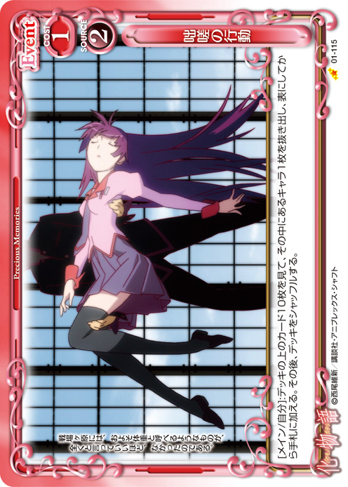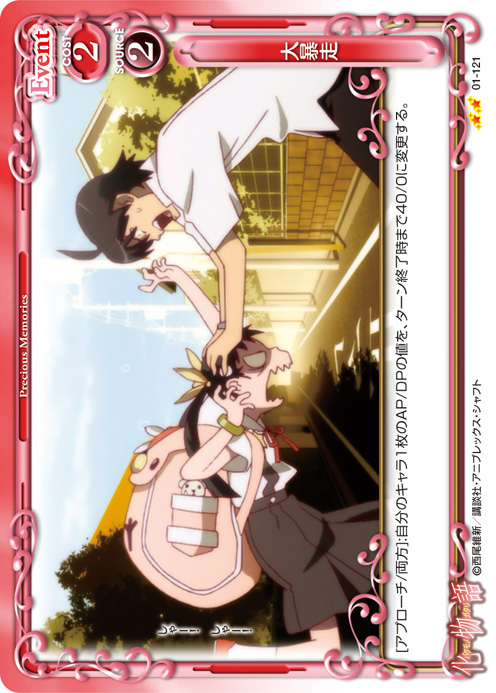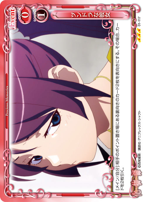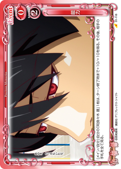 | [メイン/自分]:自分の「阿良々木 暦」1枚は、ターン終了時まで+10/+10を得る。その後、相手の手札を全て見る。 | ||