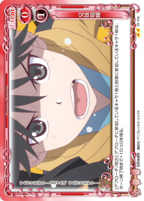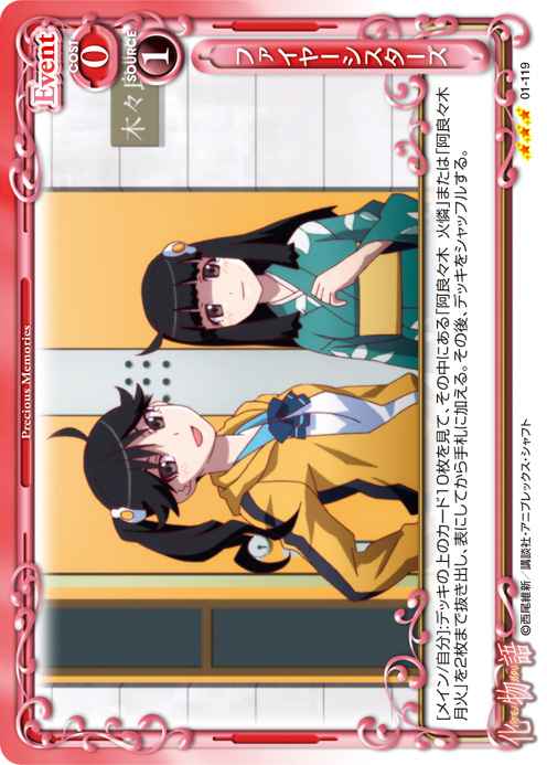 | [メイン/自分]:デッキの上のカード10枚を見て、その中にある「阿良々木 火憐」または「阿良々木 月火」を2枚まで抜き出し、表にしてから手札に加える。その後、デッキをシャッフルする。 | ||