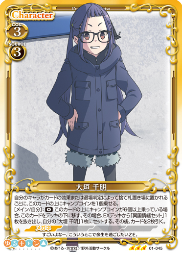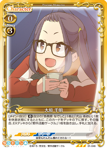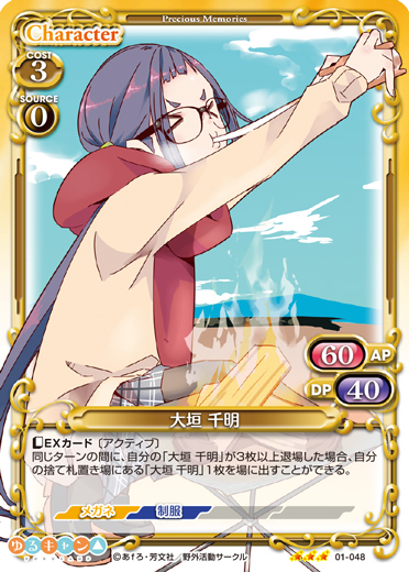 | 〔EXカード〕〔アクティブ〕同じターンの間に、自分の「大垣 千明」が3枚以上退場した場合、自分の捨て札置き場にある「大垣 千明」1枚を場に出すことができる。 | ||