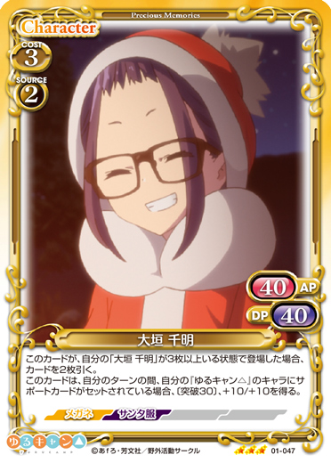 | このカードが、自分の「大垣 千明」が3枚以上いる状態で登場した場合、カードを2枚引く。このカードは、自分のターンの間、自分の『ゆるキャン△』のキャラにサポートカードがセットされている場合、〔突破30〕、+10/+10を得る。 | ||