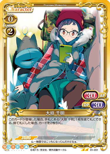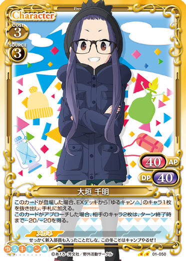 | このカードが登場した場合、EXデッキから『ゆるキャン△』のキャラ1枚を抜き出し、手札に加える。このカードがアプローチした場合、相手のキャラ2枚は、ターン終了時まで-20/-20を得る。 | ||