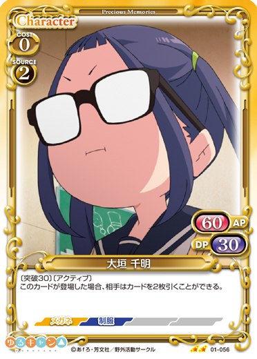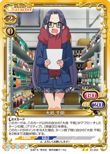 | 〔EXカード〕このカードは、このカード以外の自分の「大垣 千明」がアプローチしたターンの間、〔アクティブ〕、〔突破30〕を得る。このカードがポイントを与えた場合、ターン終了時に自分の「大垣 千明」を2枚まで活動状態にする。 | ||