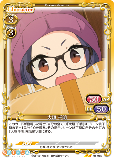 | このカードが登場した場合、自分の全ての「大垣 千明」は、ターン終了時まで+10/+10を得る。その場合、ターン終了時に自分の全ての「大垣 千明」を活動状態にする。 | ||