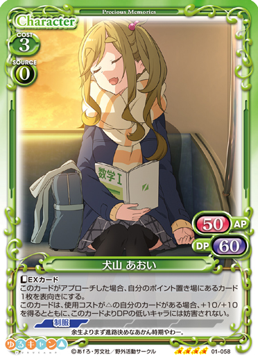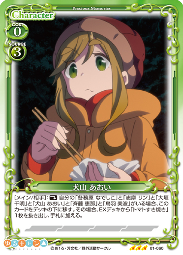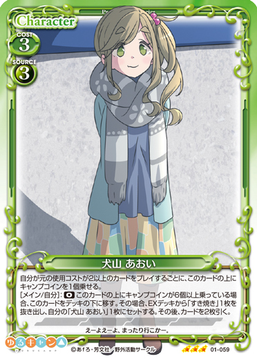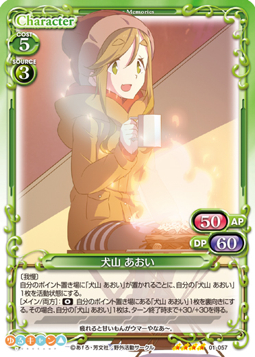 | 〔我慢〕自分のポイント置き場に「犬山 あおい」が置かれるごとに、自分の「犬山 あおい」1枚を活動状態にする。[メイン/両方]:《0》自分のポイント置き場にある「犬山 あおい」1枚を裏向きにする。その場合、自分の「犬山 あおい」1枚は、ターン終了時まで+30/+30を得る。 | ||